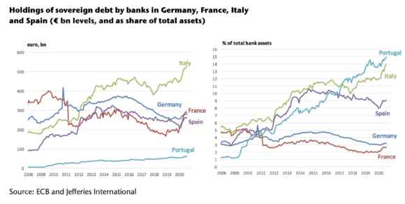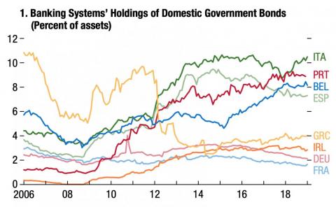 Ora, però, c’è appunto il rischio di creazione di un precedente che grava sulla decisione che Francoforte dovrà prendere entro fine mese. Un qualcosa che va al di là della stessa tenuta dell’Hfsf, perché rischia di impattare a livello sistemico e di effetto contagio sull’intero comparto creditizio ellenico. Il quale, a oggi, sconta un enorme, duplice plus di rischio. Primo, al fine di rendere efficace il Pepp, la Bce ha incluso il debito pubblico greco nella platea del collaterale accettato per operazioni di rifinanziamento. Se salta il banco di Piraeus, quella deroga reggerà ancora o i falchi in seno al board imporranno una revisione immediata? Secondo, sempre lo scorso marzo la stessa Bce ha eliminato il cap di detenzione massima di debito pubblico per le banche elleniche, di fatto un invito esplicito all’azzardo morale e al ricadere nella trappola del doom loop. E questi grafici mettono indirettamente in prospettiva il rischio: se infatti nella primavera del 2019, quando ancora era in vigore il tetto massimo della Bce sulle detenzioni di debito domestico da parte delle banche greche, queste ultime “vantavano” un livello percentuale su assets totali in area 4%, superiore a quello di Germania, Francia e Irlanda, quale può essere stato lo sviluppo prospettico a oggi, se come mostra il secondo grafico un altro campione del doom loop come l’Italia è passata nell’arco temporale di un anno e mezzo dal 10% circa di detenzioni sovrane su assets totali al 14% del 30 settembre scorso?