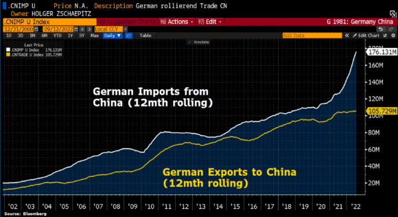 Cosa significa? Inutile che io vi annoi con ulteriori parole e ragionamenti, basta questo grafico relativo alla ratio import/export di Berlino e Pechino per capire le ragioni strategiche e tragiche di questa scelta: distruggere l’economia europea colpendo definitivamente e al cuore la sua locomotiva, già in fase di deragliamento per il caro-energia.