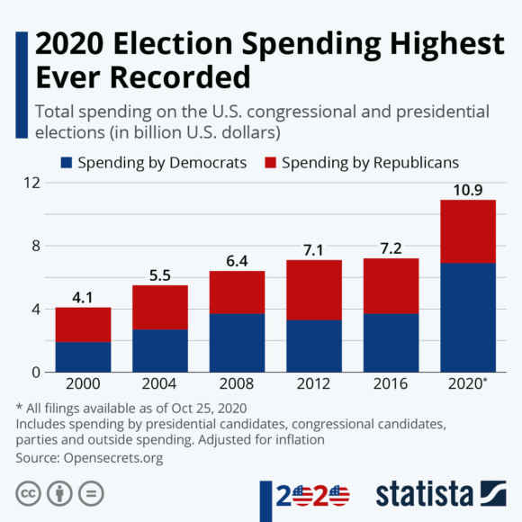 Signori, se Mosca avesse messo in campo quella cifra per destabilizzare 20 Paesi significherebbe aver finanziato sì e no l’acquisto dei volantini. Forse, quello della colla per i manifesti elettorali. Guardate questo grafico, ci mostra quanto speso da Democratici e Repubblicani per le campagne elettorali presidenziali e legislative per il Congresso. E attenzione, quelle cifre fanno riferimento a miliardi di dollari. Insomma, semplicemente per vincere elezioni che non necessitano turbative o frodi – almeno sulla carta, ovviamente – ma solo mezzi di marketing politico per convincere i cittadini, la democrazia Usa ha messo in campo qualcosa come 4,1 miliardi di dollari nella tornata risultata meno cara, quella del 2000.