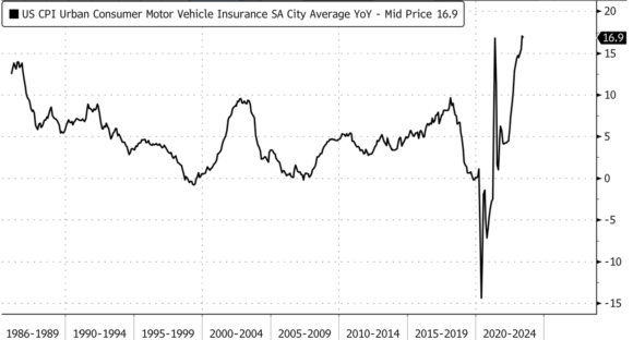 Infine, ecco che questo ultimo grafico mostra come il calo del prezzo delle auto usate registrato a giugno mostri la sua faccia meno gradevole. E certifichi quella che il Wall Street Journal ha definito la peggior crisi per le assicurazioni del ramo auto da almeno 30 anni.