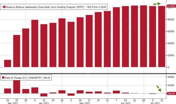 Certo, Janet Yellen ha già dichiarato che, aggiustata all’inflazione, la ratio degli interessi resta storicamente bassa. Peccato che, al netto di un Pil destinato a contrarsi causa recessione, il debito federale non calerà. Mai più. Né in termini relativi, né assoluti. L’endgame del Qe, insomma. Cercare un dimagrimento strutturale del debito equivale a togliere il proverbiale mattoncino di Lego dalla costruzione: crolla tutto. Anche perché, come mostra questo altro grafico, l’utilizzo della facility di supporto bancario della Fed – quella emergenziale e a tempo riattivata lo scorso marzo dopo il caso di Silicon Valley Bank – è tornato a salire, di fatto sancendo la seconda realtà incontrovertibile: le banche regionali, quelle da cui dipende il 70% del debito sul commercial real estate statunitense, non possono reggere senza il polmone d’acciaio della Banca centrale. Se si stacca il macchinario, da qui a un semestre sarà una Spoon River.