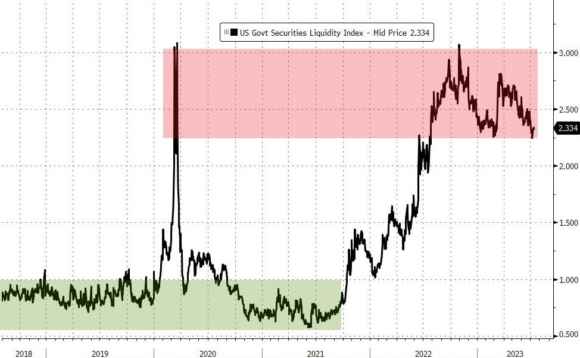 E cosa sarebbe mai il basis trading? Di fatto una strategia neutrale, poiché in via teorica dovrebbe isolare l’investitore dal rischio di fluttuazione dei prezzi. Ovvero, si va long su un asset e contemporaneamente anche short, utilizzando uno swap. Il cosiddetto cash and carry. Il rischio? Essendo strategia neutrale, formalmente assente. A parte un piccolo particolare: la neutralità è garantita dall’uso di un derivato. Problema ulteriore? Il meccanismo funziona perfettamente, a meno che non venga a mancare il lubrificante agli ingranaggi: la liquidità. Proprio ciò che sparì di colpo nel marzo 2020, causa Covid. Ed ecco che questo secondo grafico mostra come, per gran parte dell’ultimo anno, l’indice curato da Bloomberg che misura la liquidità nel mercato dei Treasuries abbia flirtato con livelli raggiunti nel picco della crisi pandemica globale. Tradotto, anche un limitato, singolo spasmo nel basis trading potrebbe innescare un effetto palla di neve a velocità siderale. E con conseguenze catastrofiche.
