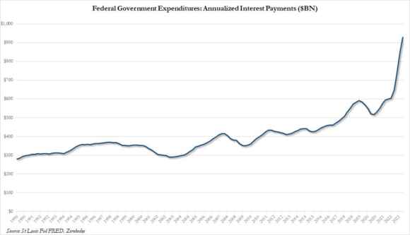 Ma dietro a questa mancetta in stile Lauro d’Oltreoceano, c’è dell’altro. C’è un mindset pericoloso. Il grafico mostra infatti come, proprio nel giorno in cui veniva annunciato il Save, Fed di St. Louis e Bea certificavano come le spese per interessi sul debito federale Usa avessero superato per la prima volta in assoluto i 900 miliardi di dollari. E stando alle proiezioni, entro un trimestre o al massimo due sarà varcato il benchmark del trilione di dollari. Da quel momento in poi, inizierà il countdown verso il Minsky Moment, la trappola del debito che diviene insostenibile a prescindere dal tasso di crescita. Ma per gli Usa e non per la Cina, come si pensava fino a pochi anni fa.