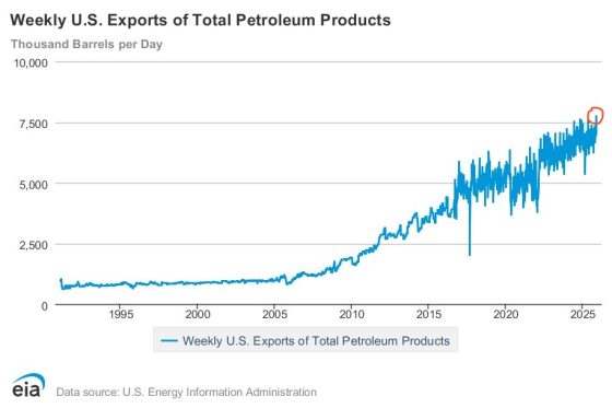 Come mostrano questi grafici, gli Usa hanno approfittato del reset nell’equilibrio degli approvvigionamenti energetici globali per divenire soggetto dominante sia in ambito di gas naturale liquefatto, il cui volume di export verso l’Europa è infatti letteralmente esploso, sia per quanto riguarda le esportazioni di prodotti e derivati petroliferi.