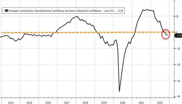 Seconda dinamica, questa: nonostante il dato positivo sull’inflazione nell’eurozona, apparentemente giunta al picco, l’indice European Industrial Confidence della Commissione Ue viaggia oggi ai minimi dal gennaio 2021 e attorno a un eloquente livello di -2.0.