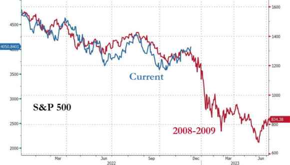 Attenzione, nel breve termine, a due dinamiche. La prima è quella rappresentata da questo grafico, il quale mostra gli andamenti comparati dello Standard&Poor’s 500 da inizio anno e nel biennio 2008-2009, quello del crollo Lehman e della conseguente crisi finanziaria.