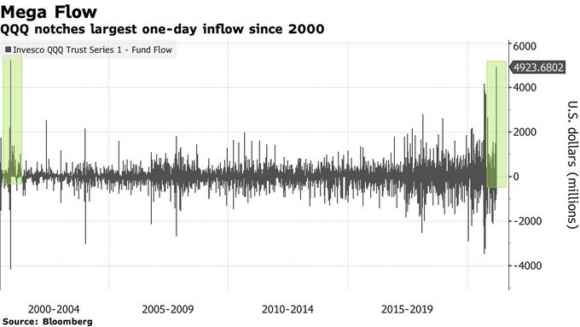 E cos’è accaduto lunedì scorso, in concomitanza con l’ennesima crisi valutaria di Ankara? Ce lo mostra questo ultimo grafico, dal quale si evince come in perfetta contemporanea l’Etf più famoso nel tracciamento del Nasdaq, l’Invesco QQQ, abbia registrato un inflow giornaliero di qualcosa come 4,9 miliardi di dollari, il massimo dal boom della stagione dot.com del 2000. Correlazione perfetta fra un debito sempre più insostenibile per il ricorso strutturale a deficit da monetizzare tramite Qe perenne e l’indice più esposto al leverage e all’espansione dei multipli: praticamente, nitroglicerina con cui si gioca a palla avvelenata. Finora, la Fed l’ha scampata.