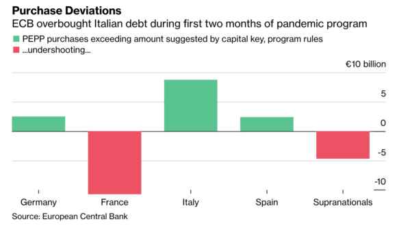 Come vi ho ripetuto per giorni e giorni nelle scorse settimane, la Bundesbank ha detto chiaramente che il piano di acquisto titoli Pepp deve essere temporalmemte limitato e strettamente legato alla crisi da Covid. Due giorni dopo quelle asserzioni nette di Jens Weidmann alla FAZ, il primo dato preliminare sul PMI mostrava timidi segnali di ripresa. Parliamo di sole due settimane fa. Ieri, poi, la conferma. Con la Francia che addirittura risaliva, unica nell’eurozona, sopra la linea di demarcazione fra contrazione e crescita di quota 50. Ed ecco che, sempre ieri, Bloomberg pubblicava un articolo nel quale venivano confermati tutti i miei timori: all’interno della Bce sta crescendo sempre di più la spaccatura rispetto al programma Pepp, tanto da definire il prossimo meeting della Banca centrale – atteso fra due settimane – il primo vero banco di prova della leadership di Christine Lagarde. E il fatto che l’articolo fosse l’apertura della homepage, parla chiaro. Così come la descrizione del nodo della disputa: l’eccesso di deviazione nel principio di capital key a favore dell’Italia (rappresentato nel grafico sottostante) tale da configurare – in caso di un ulteriore miglioramento nelle condizioni economiche macro già nel terzo trimestre – un possibile rischio di finanziamento diretto di uno Stato membro.