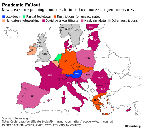 Anche oggi, due grafici parleranno al posto di molte parole. Sia per una questione di efficacia, sia perché con il passare dei giorni le formule sufficienti a dipingere il degrado in cui sta precipitando il residuo di rappresentatività di questo Paese appaiono in rapido esaurimento. Il primo grafico, in realtà, è una mappa. Questa, la quale mostra il livello di restrizioni in atto in Europa oggi per contrastare la quarta ondata di Covid.