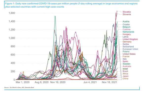 In compenso, lo stesso Massimiliano Fedriga che vuole imporre un’impronta da law and order alle nuove linee guida di contrasto pandemico è, oltre che il presidente della Conferenza delle Regioni, anche il governatore del Friuli-Venezia Giulia. Non solo Regione a forte rischio di cambio immediato di colore, ma anche epicentro del nuovo contagio, a detta di molti. E quasi tutti convinti che il motivo scatenante siano state le proteste no-vax senza precauzioni, in primis quelle molto a orologeria al porto di Trieste. Balle. La ragione sta nel fatto che ogni giorno in quella Regione entrano – senza alcun controllo sanitario alla frontiera – 12.000 lavoratori pendolari sloveni, Paese con un’incidenza di contagi al livello dell’Austria, come mostra questo grafico contenuto nello studio ad hoc appena pubblicato da Deutsche Bank: un tampone su due è positivo.