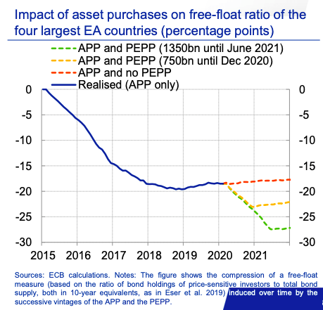 Ovvero, solo con il programma base di sostegno oppure con il programma di sostegno più il Pepp nelle sue due versioni, quella da 750 miliardi originaria e quella ampliata da 1.350 miliardi. Questa ultima ipotesi che vede il programma prolungato fino al giugno 2021 è rappresentata dalla linea prospettica in tratteggiato verde e, come vedete, porta a -30%. Ovvero, quasi un terzo del totale di flottante libero di titoli sovrani viene assorbito in automatico dagli acquisti della Bce, perdendo così – di fatto – il suo carattere di “instabilità da negoziazione” sul mercato, se mi passate la formula poco accademica. In parole povere, il firewall sullo spread, la messa in sicurezza dei differenziali. E, alla luce della deviazione sulla capital key che la Bce non solo ha rivendicato come sacrosanta, ma ha confermato che potrebbe ampliarsi, in caso i Paesi più a rischio avessero necessità di uno scudo più ampio, ecco che quel grafico sembra parlare direttamente a Italia e Spagna. Ma, soprattutto, al nostro Paese.