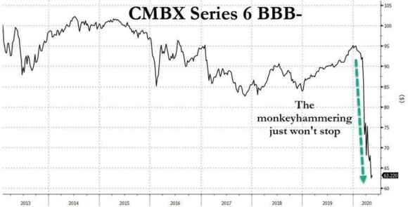 Fidatevi, nella testa di qualche pazzo alberga questa idea. La quale, oltretutto, porta con sé l’effetto collaterale di nascondere le bolle ed evitarne l’esplosione, visto che ci penserà la Banca centrale ad assorbirne le onde d’urto, operando da camera di compensazione. Vi faccio un esempio. Alla fine, la scorsa settimana anche un gigante come JC Penney ha gettato la spugna. La catena texana di grandi magazzini ha optato giocoforza per il Chapter 11 e ora tutte le proprietà verranno allocate in una nuova real estate company. Pessimo timing. Il problema sta tutto in quest’ultimo grafico, infatti. Perché la decisione è giunta in contemporanea con il nuovo minimo storico dei Cmbx serie 6, arrivati a prezzare solo 62,83 dollari, 10 dollari in meno di metà marzo: un calo sostanziatosi mentre il resto del mercato rimbalzava dal 30% dai minimi.