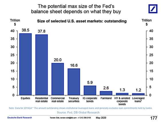 Qual è, quindi, il mio timore, anzi la mia quasi certezza distopica riguardo il futuro a breve termine del post-Covid? Ce la mostra questo altro grafico, il quale fa parte di uno studio di Deutsche Bank relativo alla platea potenziale di assets monetizzabili dalla Fed attraverso l’acquisto diretto in seno a ipotetici programmi di Qe open-ended che arrivino appunto al parossismo assoluto di intervento. Potenzialmente, lo stato patrimoniale della Federal Reserve potrebbe arrivare a quota 130 triliardi, se comprasse tutto ciò che è elencato nella tabella.