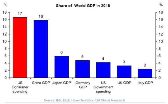Ora però guardate il secondo grafico, il quale mostra il dato disaggregato per voci del Pil mondiale a fine 2018: le prime due componenti parlano la medesima lingua del sondaggio e ci prefigurano uno shift senza precedenti, almeno a livello teorico. Ai primi due posti, pressoché identici nel controvalore sulla crescita mondiale, ci sono appunto i consumi Usa e il Pil cinese. Insieme pesano per un terzo esatto della crescita. C’è però un problema, alla luce di quel sondaggio e della campagna anti-cinese della Casa Bianca: se gli americani, fosse anche un 20% reale, davvero smettessero di comprare tutto ciò che è Made in China, chi sarebbe in grado di rimpiazzare quella messe di merci e di mantenere standard di prezzo come quelli del Dragone, in grado grazie a quel combinato di conquistare il più grande mercato del mondo, il centro commerciale a cielo aperto chiamato Usa? E di converso, a chi venderà la Cina sufficienti merci – di ogni tipo, da quelle ad alta tecnologia ai pantaloni da pochi euro – per mantenere quel tasso di sovra-produzione che garantisce il proprio Pil e la possibilità di esportare deflazione, aprendo spazi di manovra strutturali alla Pboc?