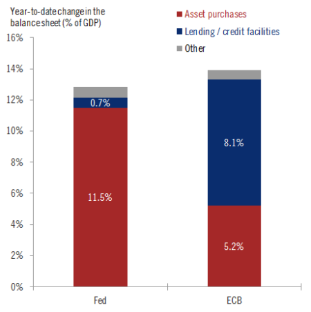 Ora, è chiaro a tutti che nel mondo manipolato del new normal da Qe perenne, paradossalmente una notizia simile avrebbe potuto addirittura tramutarsi in un driver degli indici azionari, i quali attraverso gli algoritmi pavloviani di Wall Street scontano la famosa legge del bad news is good news, visto che garantisce una Fed che non arretra di un millimetro nell’azione di supporto. Problema duplice: questo grafico mette in comparazione quanto messo in campo da inizio d’anno a oggi da Federal Reserve e Bce – attraverso il proxy del cambiamento di bilancio – a livello di supporto di mercato ed economie.