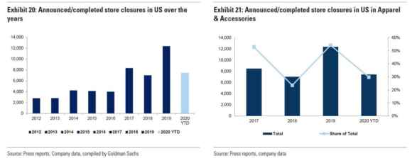 Perché dico questo? Guadate questi due grafici, il primo dei quali fa parte dell’ultimo report di Goldman Sachs relativo alle chiusure di punti vendita di commercio al dettaglio negli Usa. Da inizio anno, i negozi chiusi o che hanno già comunicato la chiusura permanente ha raggiunto quota 7.430 contro i 12.370 dell’intero 2019, più della metà. E con il peggio ancora da scontare, poiché in base a calcoli della banca d’affari, il fall-out del primo lockdown da Covid sul commercio si sostanzierà da qui a fine anno, quando il numero totale di attività fallite è atteso già oggi fra le 20 e le 25mila unità.