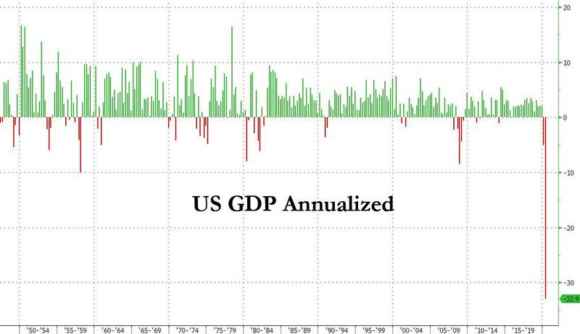 Ora, mettiamo in fila qualche elemento. A partire da quello rappresentato da questo grafico, il quale mostra come in pressoché perfetta contemporanea con la sparata della Casa Bianca, le autorità statunitensi avessero comunicato che il Pil nel secondo trimestre era crollato a livello annualizzato di qualcosa come il 32,9%. Per trovare un dato di lettura negativa precedente altrettanto orrendo occorre tornare indietro al 1958, quando però si toccò “solo” il -10%.