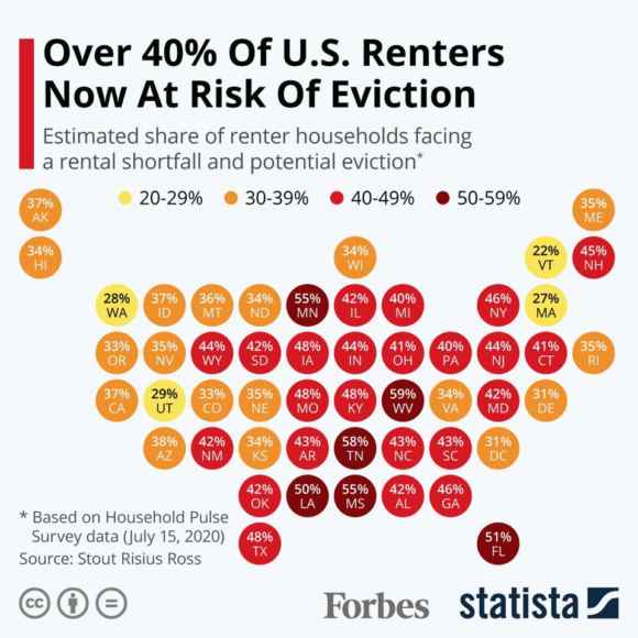Il grafico parla chiaro: su dati dell’Household Pulse Survey del 15 luglio scorso, fino al 40% degli affittuari statunitensi sarebbe a imminente (se non immediato) rischio di sfratto. I pallini con il tono di rosso più acceso rappresentano gli Stati con la percentuale maggiore di cittadini che devono fare i conti giocoforza con la prospettiva di passare l’estate sotto le stelle, ovvero di non aver più un tetto. Guardate chi spicca: la Florida, casualmente nuovo Stato focolaio. Scommettete che, da qui a breve, West Virginia e Minnesota vedranno esplodere nuovi clusters? E poi, magari, il Sud profondo (conservatore e in parte ancora confederato) del Missouri e del Tennessee?
