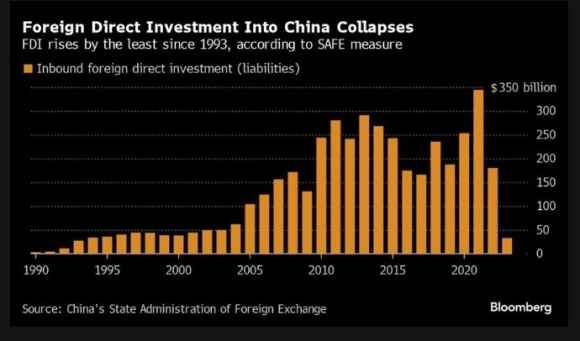 Guardate questi due grafici. Il primo ci mostra come gli investimenti esteri diretti in Cina siano oggi al minimo dal 1993, stando a dati ufficiali Safe. Il secondo come il mercato si appresti a riaprire dopo una settimana di stop per il Capodanno cinese con il bond in valuta statunitense 2025 di Evergrande che prezza 2 centesimi sul dollaro.