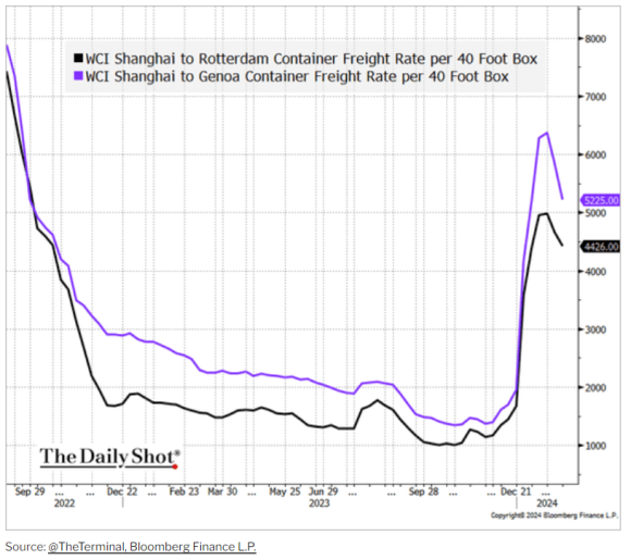 Date un’occhiata ai grafici e ponetevi la domanda: cos’è sparito, da una settimana a questa parte, dalle cronache ammaestrate? La crisi del Mar Rosso. Gli Houthi si sono arresi? La missione navale Ue e i raid anglo-americani hanno vinto? Magari ora la cronaca mi smentirà a tempo di record. Ma le immagini parlano chiaro: i costi dei noli calano. E l’indice di stress dello shipping globale torna a stabilizzarsi.