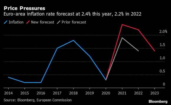 Secondo, lo mostra questo grafico: per quanto tutte le colombe del board Bce continuino a ripetere a macchinetta il mantra della fiammata temporanea, Bloomberg ha gettato un secchio di acqua gelata sulle speranze al riguardo. Se quest’anno l’inflazione dell’eurozona è prevista al 2,4%, ben oltre il target del 2%, la vera criticità sta nella revisione a rialzo toccata al tasso atteso per il 2022: la linea grigia rappresenta la proiezione originaria della Commissione Ue, mentre quella rossa traccia il trend dei nuovi modelli. La media attesa per l’anno prossimo è del 2,2% contro l’1,4% precedente.