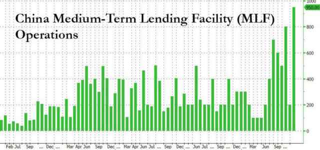 E perché invece la Cina è stata “graziata”, rimanendo in black list ma non dovendo subire l’onta di un attacco diretto e del nome in prima pagina sul Financial Times? Semplice, ce lo mostra questo altro grafico, dal quale si evince come dopo giorni di continui drenaggi simbolici di liquidità dal sistema, proprio nel giorno della conferenza stampa di Jerome Powell dopo il Fomc, la Pboc cinese abbia iniettato prestiti a breve e medio termine per 900 miliardi di yuan, circa 195 miliardi di dollari. Così, dalla sera alla mattina. E in un solo colpo.