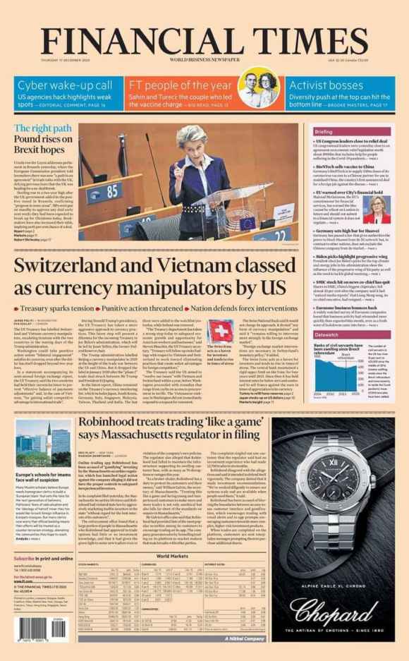 Il Financial Times ha dedicato la prima pagina alle accuse del Tesoro Usa a Svizzera e Vietnam. Accuse che nascondono una pantomima