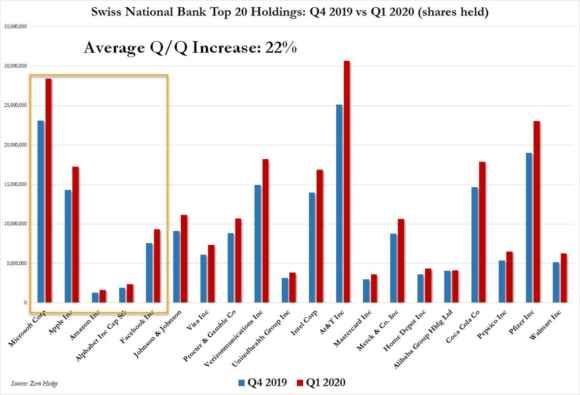 Ora, c’è però l’altra faccia della medaglia che, in punta di verità, il Financial Times avrebbe dovuto mettere in evidenza nella sua prima pagina, quantomeno nell’occhiello: questa. Ovvero, la destinazione di molti di quei franchi svizzeri “manipolati”. I quali, una volta convertiti in dollari, stanno sostenendo da interi trimestri il Nasdaq in maniera quasi imbarazzante, stante il portfolio di titoli tech Usa della Snb, la Banca centrale svizzera.