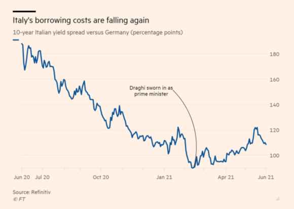 E quando il presidente dell’Europarlamento, a fronte dei dati in continuo miglioramento, rilascia un’intervista in cui ritiene necessario un raddoppio del Recovery Fund per cementare la ripresa, il minimo che ci si possa aspettare è l’altolà del Valdis Dombrovskis di turno. E guardate questo grafico, tanto per dare a Cesare ciò che gli compete: il cosiddetto effetto Draghi non esiste.