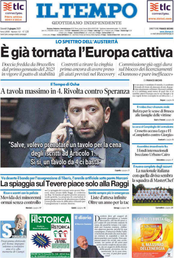 Volete la sintesi dei perché l’Europa fa bene a mettere i puntini sulle i fin da principio? Ce la offre questa prima pagina del 3 giugno: ci vuole del coraggio, infatti, dopo 30 miliardi abbondanti di fondi Sure che hanno tolto le castagne della cassa integrazione dal fuoco, 209 miliardi ufficiali di Recovery Fund e soprattutto l’ascesa della Bce al ruolo salvifico di prestatore di unica istanza del nostro debito, a fare un titolo d’apertura del genere. Occorre proprio sforzarsi, perché i numeri parlano chiaro. E arrivare a negarli merita un plauso, quantomeno alla sfacciataggine.
