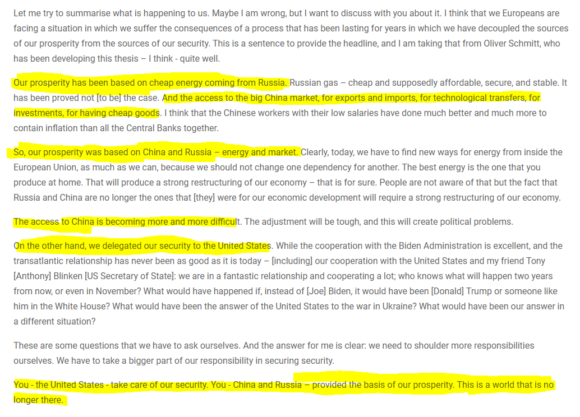 E cosa ha detto Josep Borrell agli Ambasciatori dei Paesi membri? Che la prosperità dell’Europa è dipesa in questi anni dall’energia a basso costo dalla Russia. E dalla security garantita a livello di intelligence e militare degli Usa. Di fatto, l’Ue è un bambino problematico con due badanti. Il problema è che ora queste sono in guerra fra loro e non si sopportano. Occorre scegliere, una resta, l’altra viene licenziata. Detto fatto, Borrell ammette di aver mandato a casa la Russia con la sua energia garantita e con un range di prezzo fra 25-30 euro MWh per il gas. Abbiamo scelto l’America e il suo scudo difensivo.