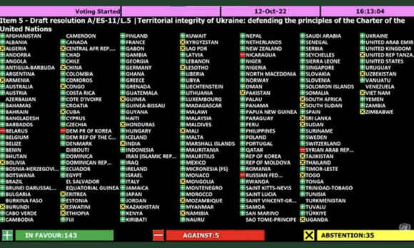E lasciate perdere le pagliacciate del Governo dei Migliori rispetto alle fonti alternative come l’Algeria e l’Angola. Perché? Guardate qui: perché nonostante le arrampicate sugli specchi riguardo la presunta indipendenza del colosso energetico di Rabat da Gazprom, ecco che la medesima Algeria risulta fra i 35 Stati che mercoledì sera all’Onu si sono astenuti nel voto di condanna per le annessioni dei territori russofoni dell’Ucraina. E insieme all’Algeria, persino due pulci economiche, demografiche e nucleari come Cina e India. D’altronde, la Russia è isolata.