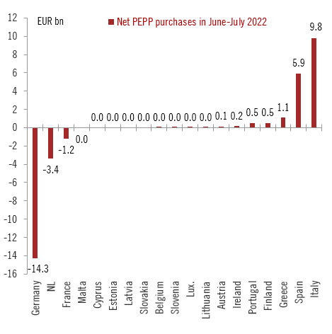 Volete la riprova sul livello di cialtroneria, assolutamente bipartisan, che ammanta la campagna elettorale? Bene, prendete lo spread e il suo calo di questi giorni. Non esiste parte politica che non lo stia festeggiando, quasi fosse un risultato a lei ascrivibile. Chi sosteneva il Governo Draghi e avrebbe voluto che quell’esperienza proseguisse, come il Pd o Italia Viva, sottolinea come sia proprio la ferma determinazione con cui il Premier dimissionario sta spingendo sull’acceleratore degli affari correnti a operare da garanzia verso i mercati, quantomeno a livello di rispetto delle scadenze per i due punti in agenda più importanti. Ovvero, Nadef e Pnrr. Chi invece, a vario titolo, ha fatto in modo che il Governo Draghi cadesse dopo averlo sostenuto, vende all’elettorato il trionfo della democrazia, ovvero il fatto che il Paese e la sua classe politica siano sufficientemente ben percepiti dai mercati da potersi permettere il lusso del voto anticipato, scongiurando l’arrivo delle cavallette vaticinato da qualcuno. Infine, chi al Governo Draghi ha sempre fatto opposizione, sta utilizzando il calo del differenziale fra Btp e Bund come incoronazione de facto ed ex ante a palazzo Chigi, tanto che qualche simpaticone addirittura parla di Meloni spread. Tutte idiozie, a 360 gradi. E ce lo conferma plasticamente questo grafico, dal quale si evince quale sia il breakdown per Paese del primo mese di reinvestimento titoli del Pepp operato dalla Bce dopo la fine, il 30 giugno scorso, dell’operatività dell’App con i suoi 20 miliardi di disponibilità mensile.
