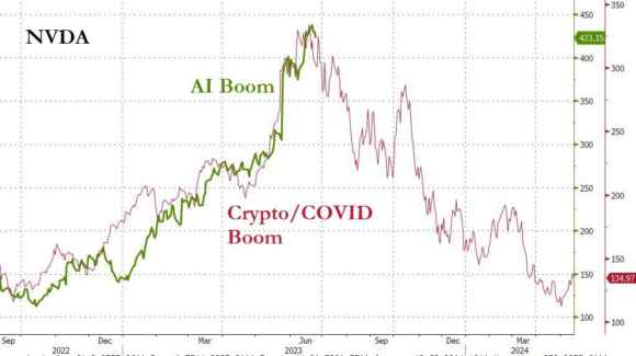 Maybe a good time to hedge, è giunto il tempo di coprirsi davvero dal redde rationem, il quale – meglio sottolinearlo da subito – sarà strumentale a un drastico, immediato e provvidenziale taglio dei tassi Fed? Il secondo grafico postato nei commenti sembra dire di sì, guarda caso riportando ancora una volta in auge il parallelo fra la situazione attuale e quella delle fasi esplosive della pandemia attraverso la performance di un titolo-flagship di ogni bolla da unicorno autoalimentante come Nvidia.