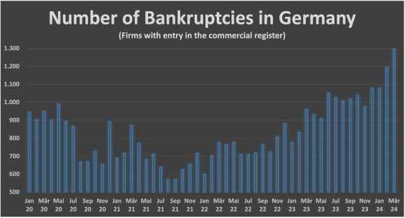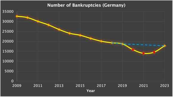 Il numero di fallimenti aziendali in Germania non ha paragoni. A marzo l’aumento mensile è stato del 9% per un totale di 1.297, mentre su base annua siamo addirittura al +35% e al +30% rispetto alla media del terzo mese dell’anno nell’arco temporale del triennio pre-Covid 2016-2019. Ripeto, signori. Stiamo parlando della Germania, l’ex locomotiva d’Europa. Ormai terminata su un binario morto. E ce lo mostra drammaticamente il secondo grafico. La parte che ci interessa è quella del biennio fra fine del 2020 e fine del 2022, quella contrassegnata dal calo nella linea di tendenza e dai tre puntini rossi. Questi ultimi rappresentano altrettanti Piani di sostegno federale per le piccole e medie imprese tedesche, un diluvio di prestiti agevolati e garanzie statali con cui Berlino ha affrontato prima la pandemia e poi la crisi energetica da sanzioni, quella costata oltre 20 miliardi solo per la nazionalizzazione di Uniper. Bene, il trend della linea gialla è proprio quello dei fallimenti aziendali. Tradotto, la Germania è diventata un’economia totalmente dipendente da sussidi e aiuti di Stato. Il capolavoro di Commissione Ue e Bce è compiuto. Gli Stati Uniti sentitamente ringraziano. Mentre il loro agente all’Eliseo sogghigna, pronto a rinegoziare da un punto di forza – nonostante la criticità macro senza precedenti del suo Paese – il patto renano 2.0.