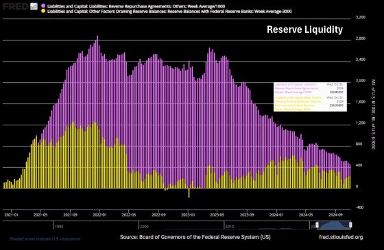 Ora date un’occhiata a questo grafico: nella settimana conclusasi mercoledì scorso, la Reserve Liquidity ha patito un altro calo per 23 miliardi.