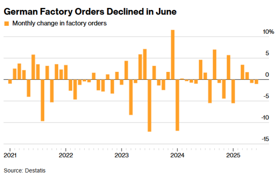 Ora guardate questo grafico, fresco fresco di pubblicazione del dato degli ordinativi industriali tedeschi relativi al mese di giugno. Le aspettative degli analisti erano per un +1,1%, mentre la realtà ha segnato un inaspettato -1%. Questo nonostante il flusso di front-load nelle esportazioni che ha caratterizzato i due mesi che hanno portato all’accordo siglato in Scozia fra Donald Trump e Ursula Von der Leyen.