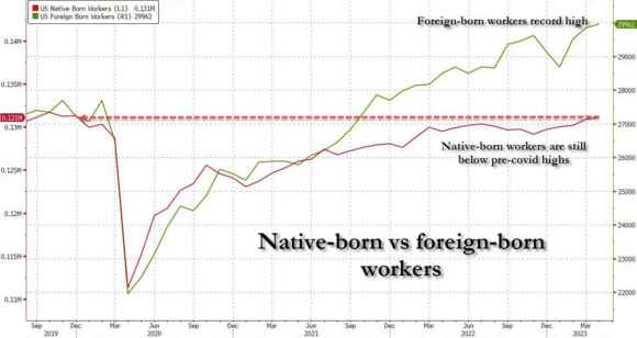 Ora guardate il grafico: tutti i nuovi posti di lavoro generati negli Usa dalla crisi Covid in poi sono stati appannaggio di stranieri. Nel febbraio 2019 erano 27,8 milioni, nell’aprile di quest’anno erano 30 milioni. I lavoratori americani, invece, ancora non hanno recuperato il livello pre-pandemia (131,7 milioni in ottobre 2019 contro gli attuali 131,1).
