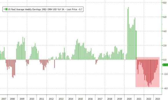 Ora invece guardate questo altro grafico: sempre negli Usa, l’inflazione ha appena eroso il potere d’acquisto dei salari per il 26° mese di fila. Oltre due anni.