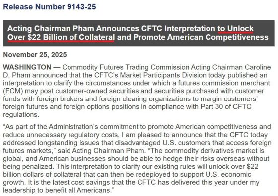 Guardate qui cosa è accaduto in data 25 novembre e nel silenzio generale: oltre 22 miliardi di dollari in collaterale sono stati appena liberati dall’ultimo, clamoroso atto di deregulation emergenziale e in corsa della Cftc. E mica una decisione da poco. Anzi, mica un’interpretazione da poco, quasi la Cftc stesse parafrasando Anna Oxa e uno dei suoi più grandi successi.