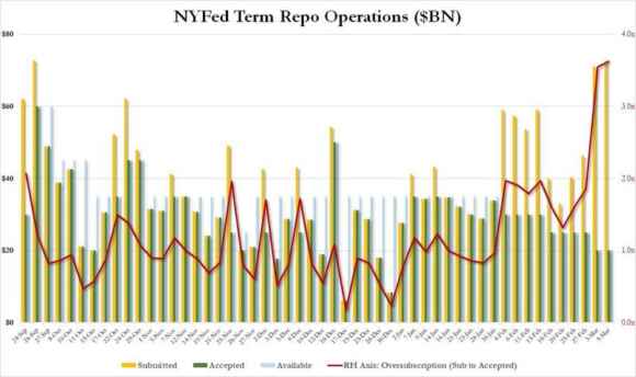 Sapete cosa significa quel dato, nemmeno troppo in codice? Segnala tempesta in arrivo sul mercato azionario. Un po’ come fa questo altro grafico, dal quale desumiamo che l’asta term tenutasi alla Fed di New York giovedì ha visto una sovra-iscrizione della domanda pari a 3.6x, ovvero richiesta per 72 miliardi di dollari a fronte di solo 20 disponibili. Scusate, ma il problema sul mercato repo overnight che lo scorso settembre fece ritornare in campo la Federal Reserve dopo dieci anni in panchina, non era solo temporaneo e dovuto alle scadenze del terzo trimestre?