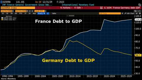 D’altronde, la guerra ai populismi, la caccia alle streghe russe a cosa servono, se non a garantire che gli spread vengano tamponati dalla Bce? O pensate davvero che Vladimir Putin abbia rispolverato il vecchio obiettivo sovietico del far abbeverare i cavalli nelle fontane di Roma? La Germania sa che per sopravvivere occorre far terminare quanto iniziato da Mario Draghi con il Whatever it takes. La Germania sa di poter battere l’inflazione con armi ordinarie di bilancio, mentre questo grafico ci dimostra come Italia e Francia non possano.