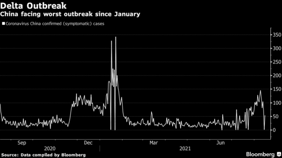 La prima è arrivata dalla Cina ed è sintetizzabile in tre numeri, relativi ad altrettante rilevazioni macro per il mese di luglio. Vendite al dettaglio +8,5% contro le attese di +10,9%, investimenti fissi nel primo semestre +10,3% contro attese di +11,3% e produzione industriale +6,4% contro consensus del +7,9%. Tradotto, la Cina sta rallentando. E nettamente. La ragione? Ce la mostra questo grafico: l’attuale picco di contagi da variante Delta rappresenta il peggiore e più serio dallo scorso gennaio. E le conseguenze si stanno facendo sentire, in ossequio al motto del battito d’ali di farfalla a Est che si tramuta in tsunami. Il più grande porto marittimo del mondo per tonnellaggio merci (e il terzo in termini di traffico di container) la scorsa settimana ha chiuso uno dei suoi principali terminal a seguito di un caso di Covid-19. E ora il timore è che quanto accaduto all’hub cinese di Ningbo-Zhoushan possa assestare il colpo mortale alla supply chain globale e – di conseguenza – alla dinamica dei prezzi, stante la conferma arrivata ieri di operatività ancora bloccata rispetto alle attività di inbound e outbound dei container.