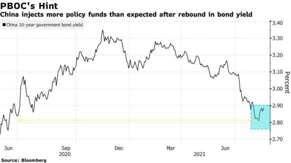 E se l’Australia ha ulteriormente intensificato controlli e restrizioni su tutto il territorio nazionale e chiuso le frontiere fino a fine anno nel tentativo di bloccare il dilagare della variante Delta in arrivo dal Far East, venerdì scorso il portavoce della Chinese National Health Commission, Mi Feng, è stato chiaro: «A oggi, i casi diagnosticati a livello locale sono in crescita per il 19mo giorno di fila e coinvolgono 16 province del Paese». E questo grafico mostra come la reazione della Pboc sia stata immediata: dovendo far fronte a circa 700 miliardi di yuan (108 miliardi di dollari) di prestiti a 1 anno che andavano a scadenza il 16 agosto, la Banca centrale del Dragone ha iniettato più liquidità del previsto nel sistema, al fine di evitare un’ondata di default su obbligazioni interne.