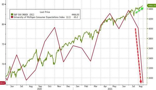 Ipocrisia allo stato puro. Sintetizzabile a meraviglia da questo ultimo grafico, il quale mostra al meglio la situazione: compara l’ultimo dato relativo alla fiducia dei consumatori statunitensi tracciati dall’Università del Michigan (UMich) e pubblicato venerdì scorso con il rally dello Standard&Poor’s 500: ancora qualche dubbio su quale sia l’unico, reale beneficiario del Qe perenne e permanente? E del perché dovremo convivere con l’emergenza strutturale dell’endemia, tanto che – a tempo di record – Pfizer ha già presentato alla Fda statunitense gli studi preliminari del suo boost di vaccino, il famoso richiamo che potrebbe diventare fisso a livello annuale?