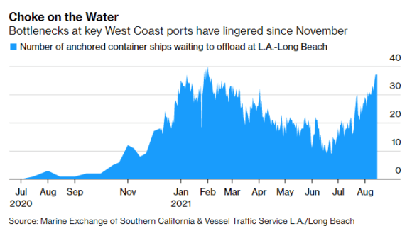 Con le compagnie che diramano avvisi di ritardi e re-indirizzano le rotte, infatti, l’accaduto va a inserirsi in un contesto già esplosivo: a luglio, il PPI – i prezzi alla produzione – sia cinese che statunitense ha toccato livelli da record assoluto. Tradotto, quei prezzi alla produzione stanno distruggendo i margini delle aziende. E gli aumenti presto saranno giocoforza trasferiti lungo la filiera. Questo grafico mostra la situazione di congestione al porto di Los Angeles/Long Beach, il principale Usa per il traffico commerciale: i colli di bottiglia creati da navi ancorate e in attesa di scarico sono già tornati al livello critico dello scorso novembre. E il fall-out in arrivo da Ningbo-Zhoushan non si è ancora palesato, essendo i primi tempi di ritardo calcolati su 3-4 giorni dalla scoperta del caso di Covid di giovedì scorso: potenziale paralisi totale, quindi.