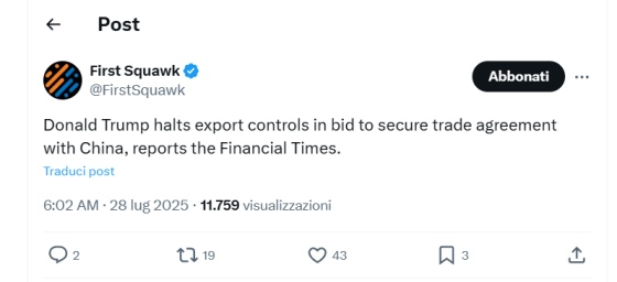 Proprio ieri, fresco di un accordo con l’Europa che ha monopolizzato a dovere le prime pagine, ecco che Washington annunciava un rinvio di altri 90 giorni dell’ingresso in vigore delle tariffe reciproche con la Cina. Ma non solo. Anche il ritiro dei controlli sull’export tech proprio verso la Mainland del Dragone, al fine di assicurarsi un accordo. Almeno così diceva il Financial Times.