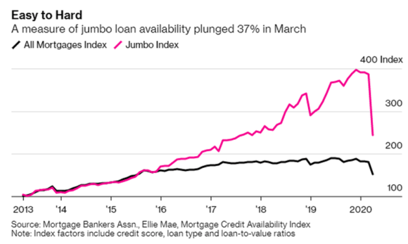 Il Jumbo Index, tracciatore del livello di disponibilità dei cosiddetti Jumbo loans, a marzo ha segnato un netto -37%. Si tratta di mutui con valori molto più alti della media, solitamente accesi da clientela facoltosa, con ottimo rating di credito e collaterale da porre a garanzia. Di più, il tasso applicato a questa categoria la settimana scorsa era del 3,68%, oltre 30 punti base sopra quello convenzionale, lo spread più alto dal 2013. Cosa temono quindi le banche Usa, tanto da farle rinunciare anche a un business così formalmente sicuro e profittevole?