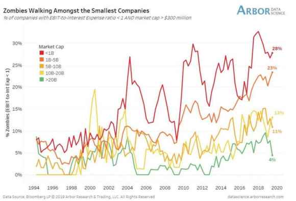 Questo secondo grafico ci mostra infatti come la politica di tassi bassissimi posta in essere da tutte le Banche centrali del mondo abbia generato un mostro proprio all’interno del comparto corporate, ovvero il proliferare delle cosiddette zombie firms o zombie companies, cioè aziende incapaci di far fronte al proprio servizio del debito attraverso il normale flusso di cassa. Bene, il grafico ci mostra come a crescere a dismisura in questa poco onorevole e poco rassicurante categoria siano le aziende piccole e medie in base al loro valore di mercato, rappresentante dalle linee rossa e arancione.