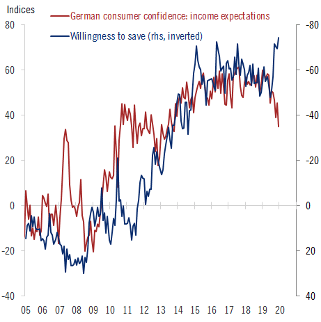 Guardate questo grafico, perché racchiude in sé tutto il senso di ciò che dovremo affrontare da qui alla primavera. Mostra come in Germania, di fatto ancora l’economia benchmark dell’eurozona, sia in atto una divaricazione che non ha precedenti. La percezione di miglioramento salariale e la fiducia economica della popolazione in generale è ai minimi da 6 anni, mentre la propensione al risparmio è ai massimi record. Praticamente, la fotografia della stagnazione.